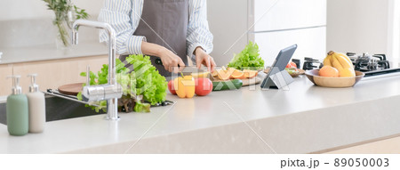 キッチンでタブレットパソコンの動画を見ながら料理をする主婦のイメージカット