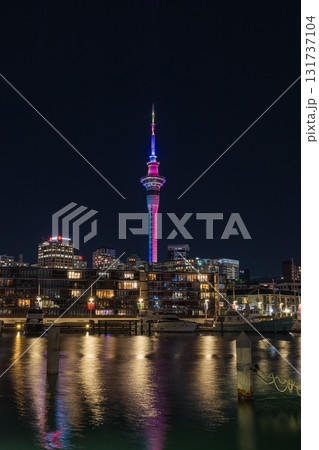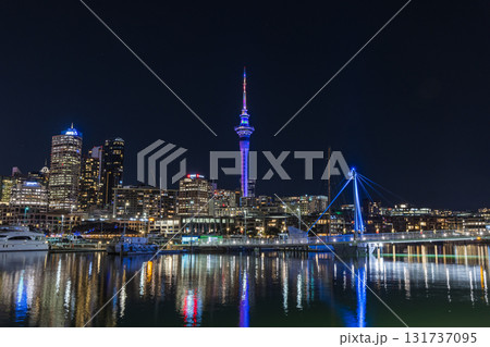 ニュージーランド オークランドのバイアダクトから見えるスカイタワーとヨットーハーバーの夜景