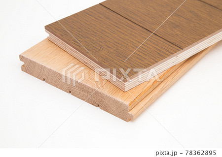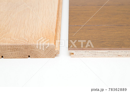 床材の種類 無垢材フローリング(左)と複合フローリング(右)