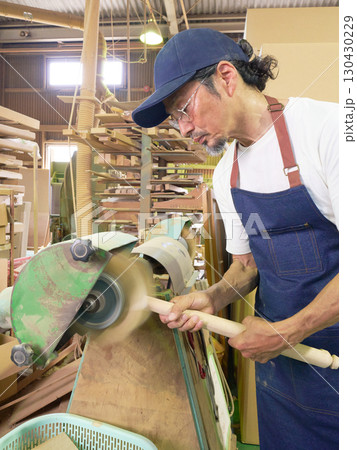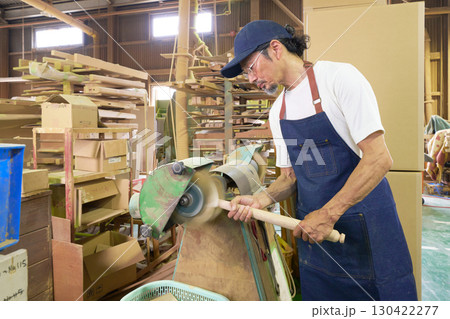 回転研磨機で木材を加工する熟練の手仕事