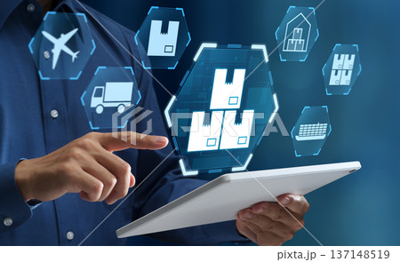 在庫管理システム。在庫の追跡とコントロール。注文処理のためにタブレットを使うビジネスマン。
