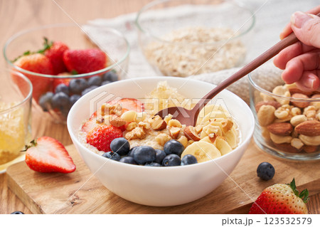 ボウルからこぼれるオートミール えん麦 青縁のボウルとオートミール ロールドオーツ