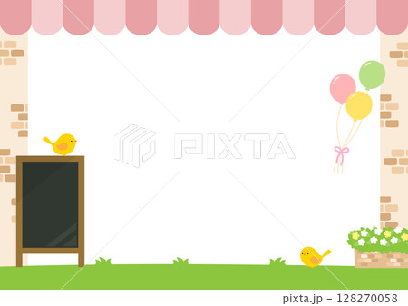 カフェのフレーム、ピンクのテント屋根と黒板と風船