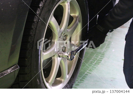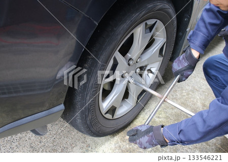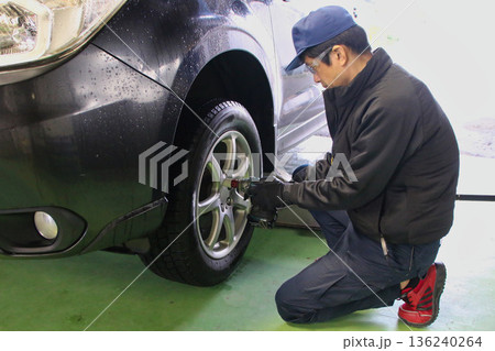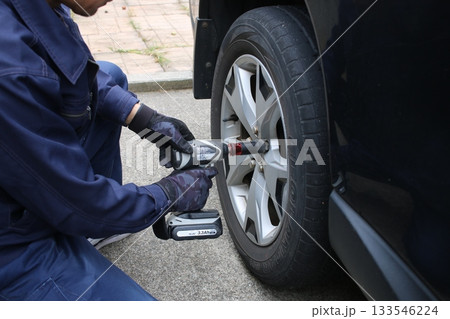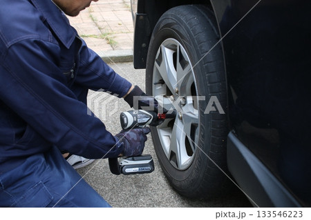 タイヤ交換、点検整備をする男性