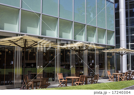 ホテル中庭、開店前のオープカフェ(横浜、ホテルニューグランド)