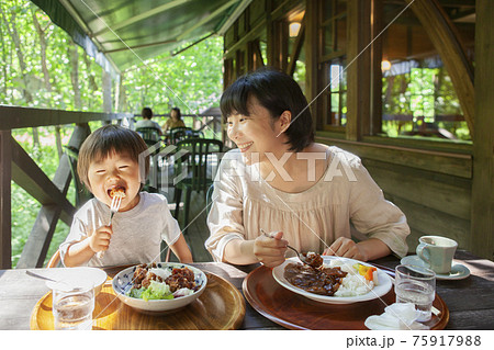 テラス席で外食を楽しむ親子
