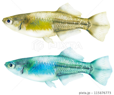 日本産ヒカリ体型メダカの魚体(雄、金色とターコイズの2色、リアルレタッチ切り抜きイラスト)