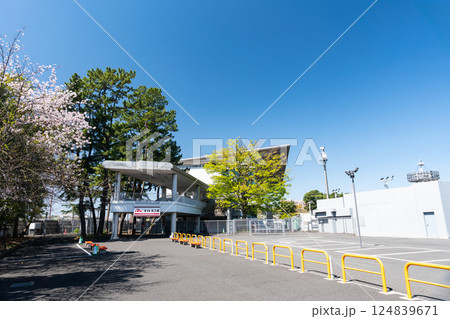 京王閣競輪場の入口と桜の木 春の青空 東京都調布市多摩川4丁目