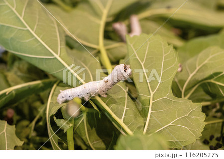 桑の葉を食べる蚕の幼虫の写真