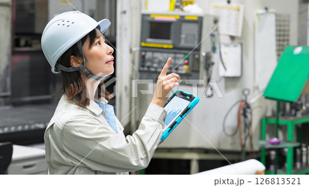 タブレットを持って工場機械を点検する女性作業員