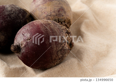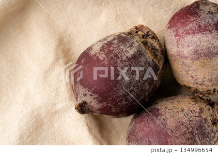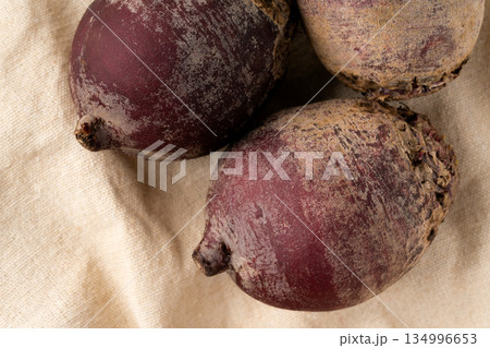 布の上に置かれたビーツ(テーブルビート)のクローズアップ