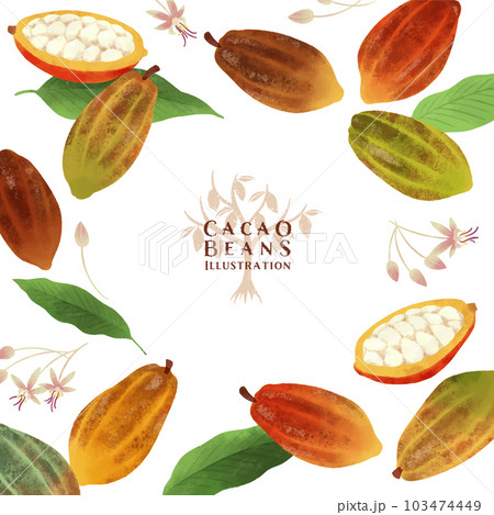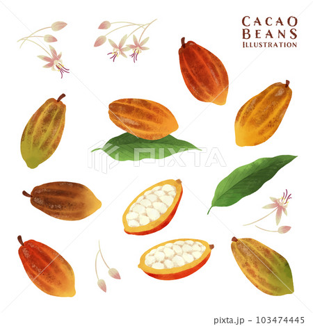 いろいろなカカオ豆・花と葉っぱの水彩イラスト/白