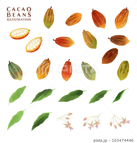 いろいろなカカオ豆・花と葉っぱの水彩イラストセット