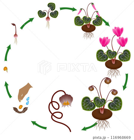 Cycle of growth of a plant of a cyclamen isolated on a white background.