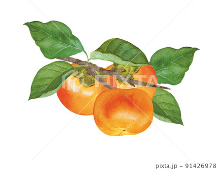 オシャレなおいしそうな熟した柿と柿の木の葉っぱイラストベクター素材