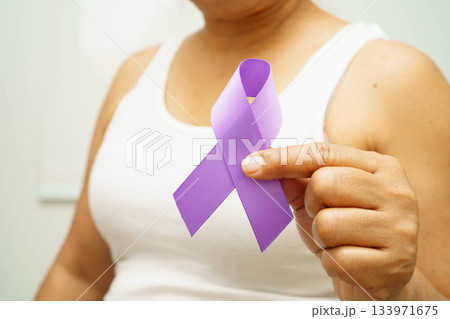 Asian woman with purple ribbon for September World pancreatic cancer day or world Alzheimer day.