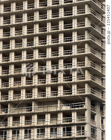 Repetitive pattern of balconies on a tall residential building photographed in a vertical format
