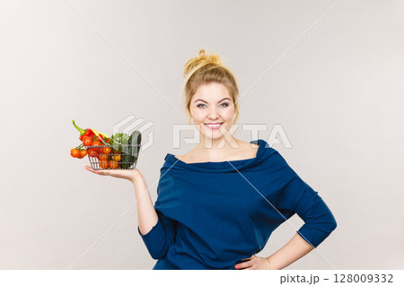 A woman holds fresh fruits and vegetables. The concept of healthy eating, nutrition, and a balanced lifestyle. Generative AI.