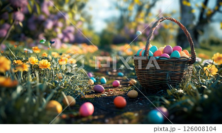 A low shot of colorful Easter eggs trailing to a secret basket, implying a joyful egg hunt in a garden