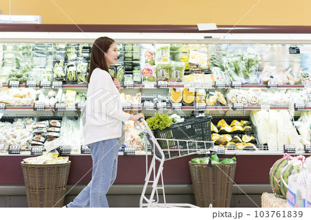 スーパーで買い物かごにトマトを入れる女性買い物客手元