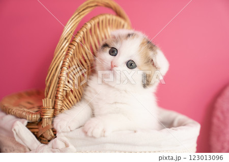 Cute kitten in floral basket with butterflies and pink blooms. Valentine animal cartoon character.