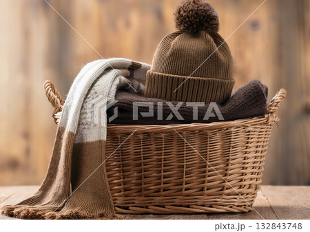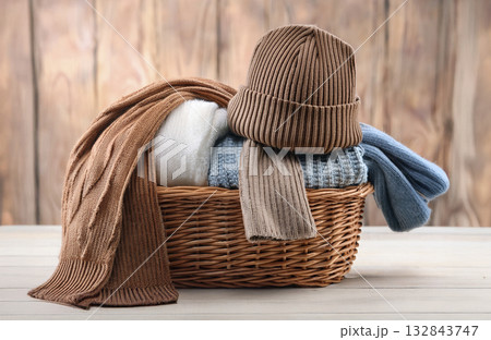 Yarn and needles in wicker basket, cozy accent for hobby and relaxation. Wicker basket near grey sofa in living room