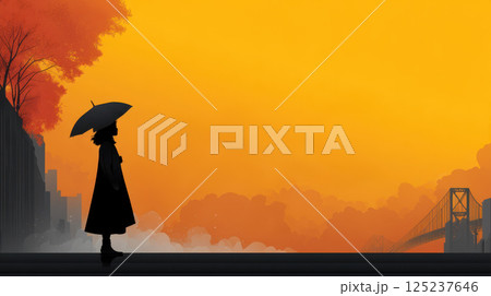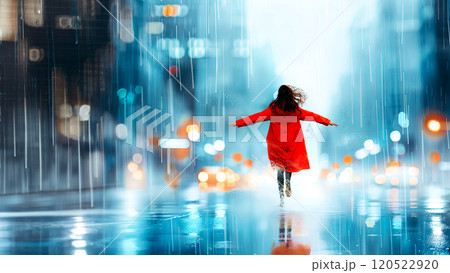 Silhouette of a young woman in a red coat walking in the autumn rain, concept for advertising vitamins for prevention and health protection
