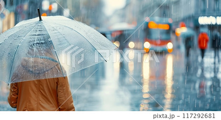 Person holding transparent umbrella while walking in rainy city street on a gloomy day
