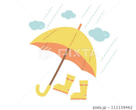 Rainy weather. Rubber boots, umbrella dark clouds and waters drops circle composition. Protect from bad season rainfall. Monsoon elements. Spring symbols isolated. Vector illustration