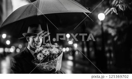 Noir style black and white vintage photography with noise, lonely man with umbrella and flowers standing on rainy street waiting for date, copy space for nostalgic atmosphere concept in retro style