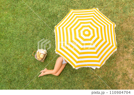 Woman in white bikini with basket for picnic lying under yellow umbrella on the green grass sunbathes at summer day. Top view, drone, aerial view.
