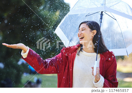 Outdoor, smile and woman with umbrella for rain, winter season and weekend walk for relax. Female person, happiness and shield from storm weather with hand for water drops and fun in nature park