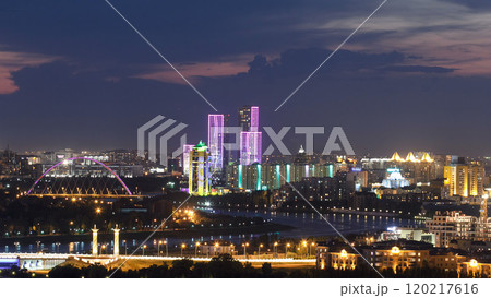 Elevated night view over the city center and central business district with bridge and river timelapse from rooftop, Kazakhstan, Astana