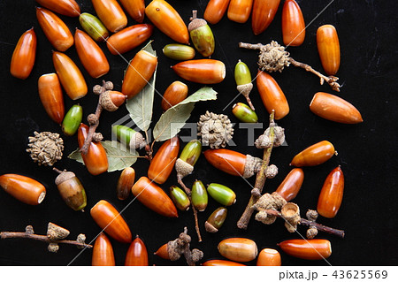 Beautiful nature background for autumn time. Fruits of the oak tree. (Quercus robur)