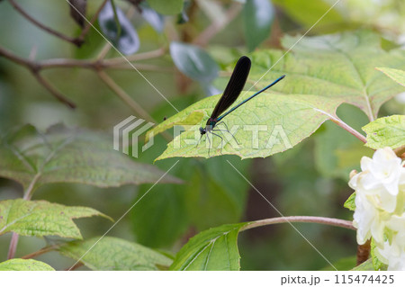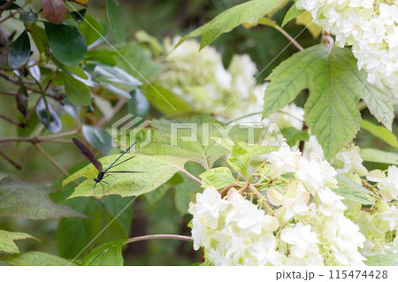 柏葉アジサイの葉に止まるハグロトンボ
