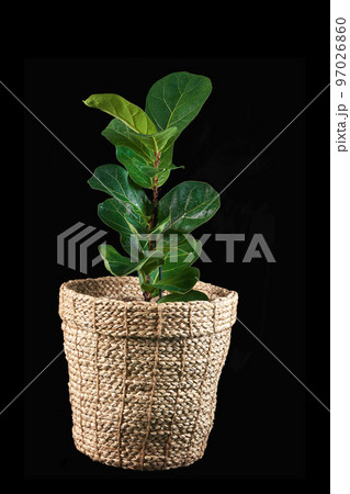 Ficus lyrata in a wicker pot on a black isolated background. The concept of a home interior , a flower shop. Fiddle leaf fig. Copy space.