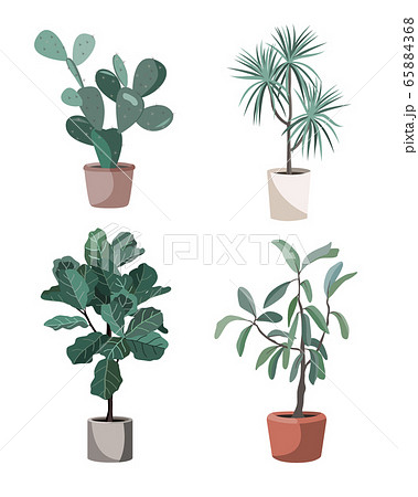 Indoor houseplants vector. Potted home plants illustration. Stylish greenery in pots for the flat design interior decoration. Ficus Lyrata, prickly pear, dracaena