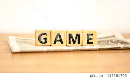 Game symbol. Concept word Game on beautiful wooden blocks on newspaper. Beautiful wooden table white background. Business, lifestyle and game concept. Copy space.
