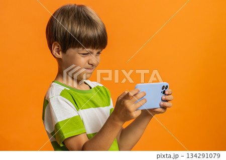 Happy boy playing racing drive simulator shooter video games on smartphone celebrate victory win