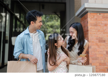 Joyful Family Shopping Experience with Parents and Children Enjoying a Day Out Together in a Modern Urban Setting
