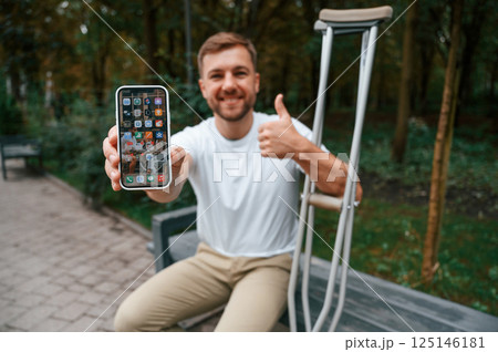 Holding and showing smartphone. Man with crutches is in the park outdoors. Having leg injury