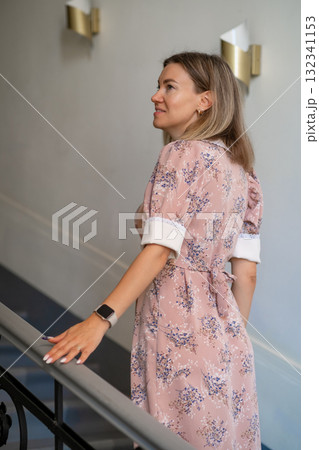 Middle-aged businesswoman in a tailored beige suit sits on stairs checking her phone in an urban
