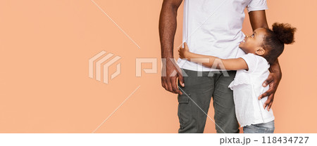 A little black girl with dark brown hair in a ponytail is hugging her father from behind while looking at him with a smile. He is wearing a white shirt and khaki pants, copy space