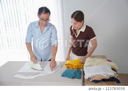 Father Teaching Daughter to Iron Clothes in Modern Home Setting for Family Bonding and Life Skills Learning