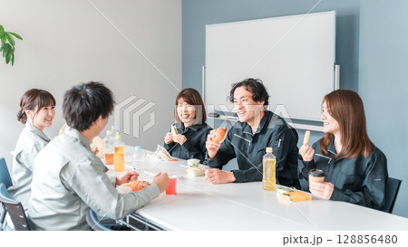 休憩室でランチ,お弁当を食べる作業服姿のビジネスマン男女
