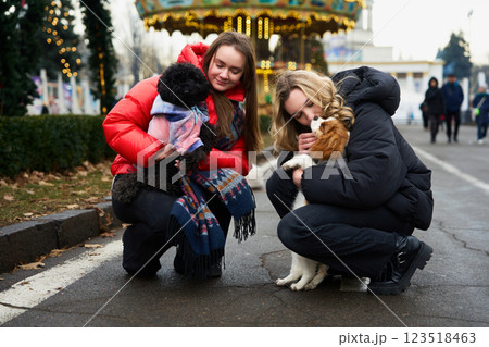 Two young women enjoy a winter outing with adorable dogs at a festive fairground