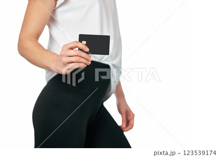 female hand holding black premium credit bank card on white background. credit card for online payment
