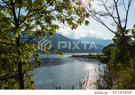 ネパール 夕暮れ時のポカラのダムサイドのペワ湖の風景