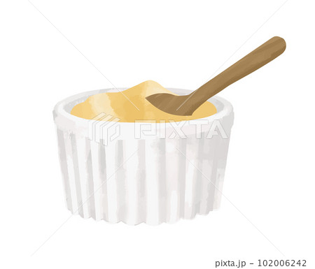 カップに入ったプリンとスプーンのセット 卵料理の手描き水彩イラスト素材