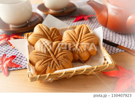 六つ目籠に盛られたもみじ饅頭と紅葉